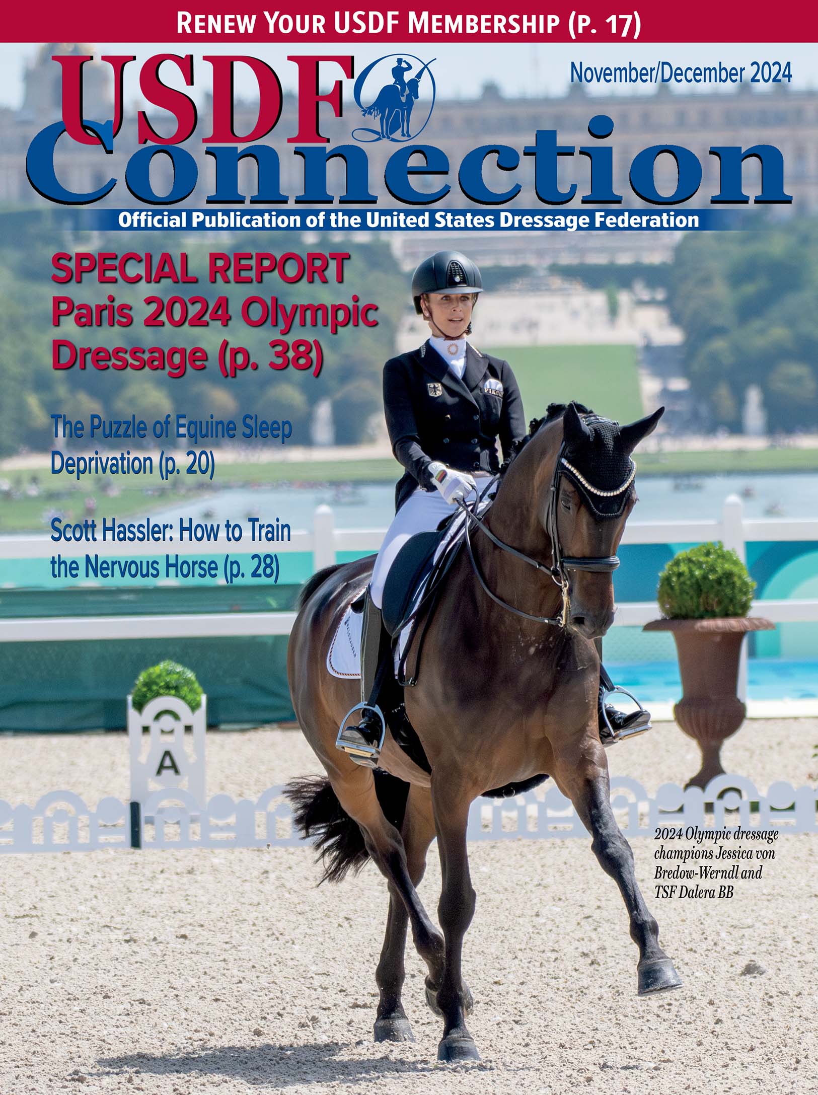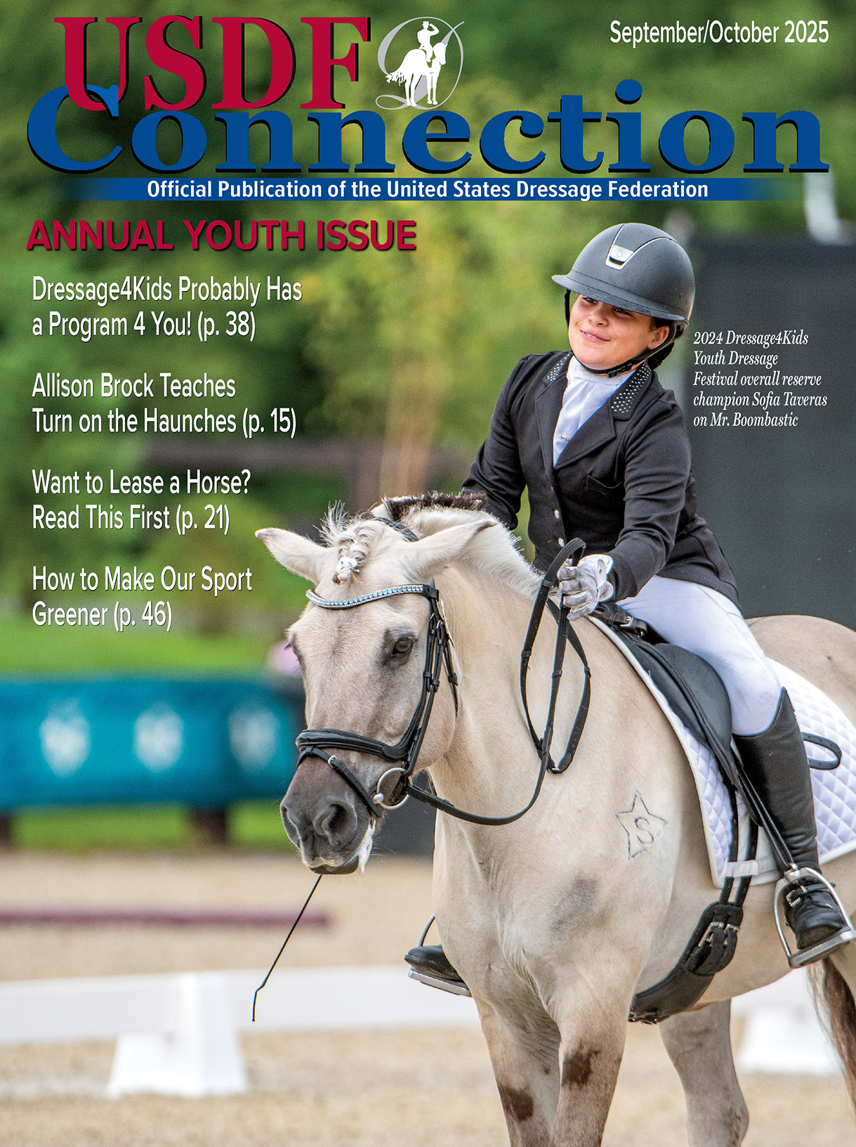 USDF Connection is mailed to members of the federation and subscribers. It offers an informative mix of USDF and American dressage news; a calendar of programs, events and horse shows; educational articles; feature stories; and commentary by many of the most recognized and respected names in dressage.